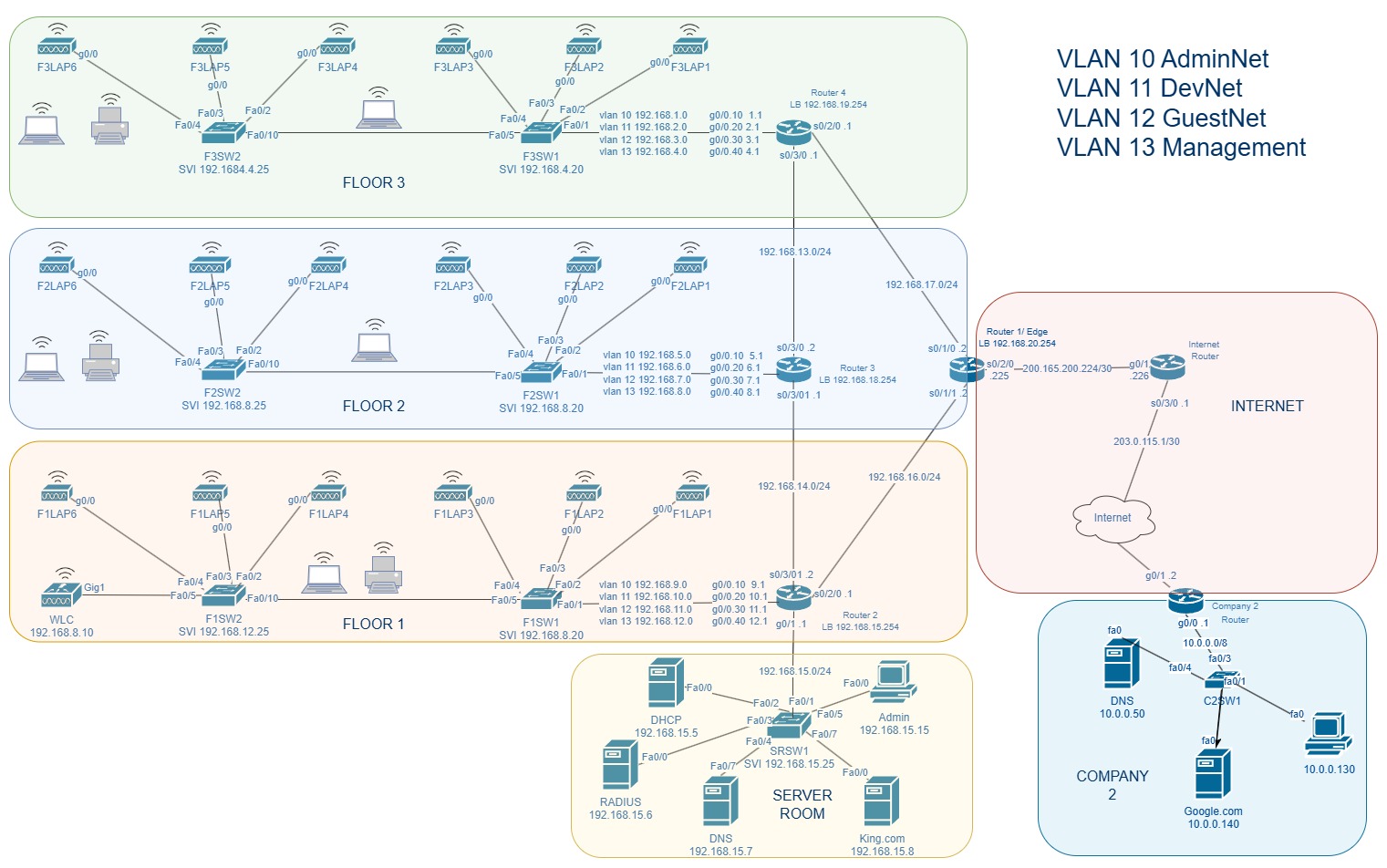 Se videoDesignade och konfigurerade ett trådlöst nätverk för tre våningsplan med flera VLAN och inter-VLAN-kommunikation. Implementerade EIGRP-routing, NAT, DHCP, RADIUS, DNS och HTTP-servrar samt en Wireless LAN Controller för hantering av accesspunkter med WPA2-säkerhet. Dokumenterade hela lösningen och skapade detaljerade IP-adress tabeller.